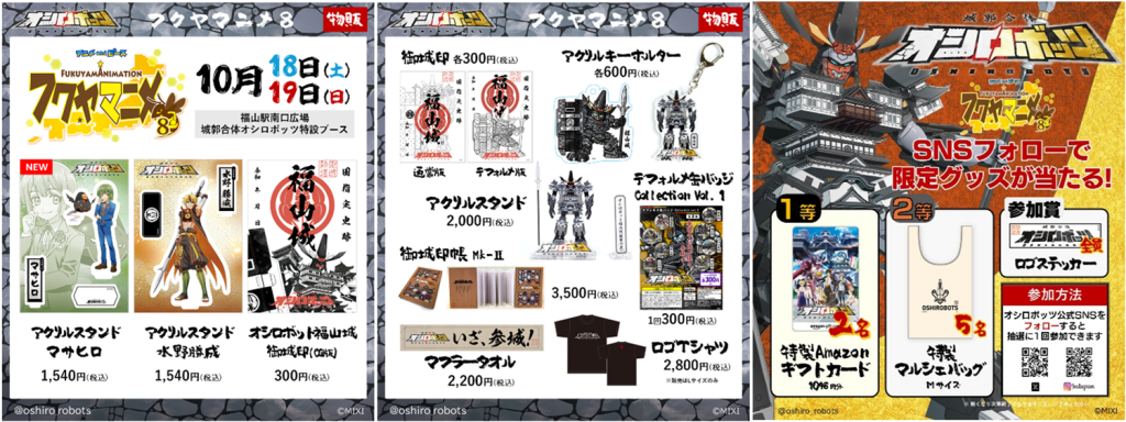 株式会社MIXI(東京都渋谷区、代表取締役社長 上級執行役員 CEO:木村 弘毅)は、2025年10月18日(土)、19日(日)広島県福山市にて開催される中国地方最大級のアニメイベント「フクヤマニメ8」にMIXI_ANIMEオリジナルコンテンツ『城郭合体オシロボッツ』のブースを出展、第2弾となるARキャンペーン「巨大ARオシロボット 福山城を起動せよ!」を実施します。ブースでは、オシロボット福山城のノベルティ配布、パイロット・マサヒロのアクリルスタンドをはじめとしたオシロボット福山城の関連グッズを販売します。