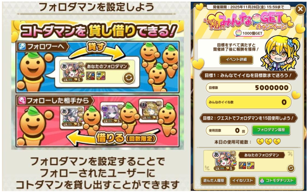 7.5周年を記念して、「「イイね!」を送ってみんな虹のコトダマGETキャンペーン」を開催します。キャンペーン期間中は「フォロダマン」機能が期間限定で登場し、フォローしたユーザーのコトダマンと一緒にクエストにクエストに挑戦することできます。クエスト終了後には「イイね!」を送ることができ、全ユーザーの「イイね!」合計数が目標を達成し、さらに自身が15回以上フォロダマンを利用すると、報酬として「虹のコトダマ」を獲得できます。
