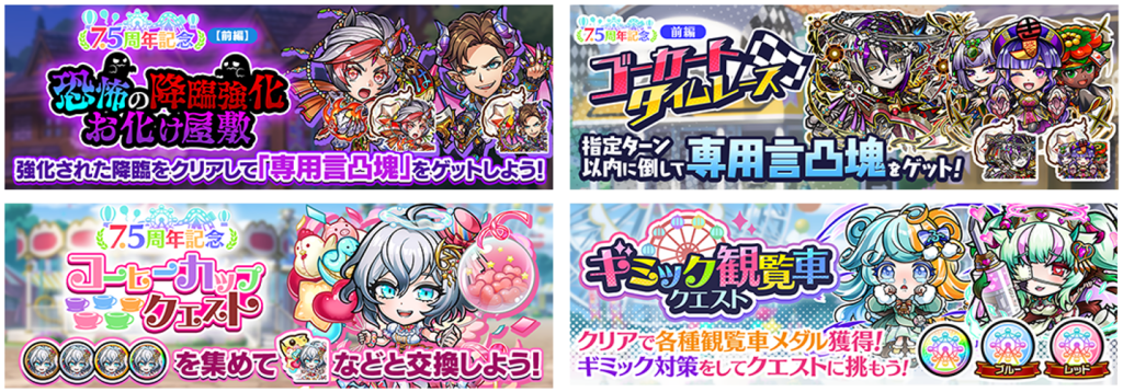 過去の降臨クエストが難易度アップした「恐怖の降臨強化お化け屋敷」や、曜日ごとにギミックが変化する「ギミック観覧車クエスト」など、遊園地のアトラクションをイメージした特別なクエストが登場します。各クエストをクリアすることで、それぞれ異なる報酬を獲得できます。