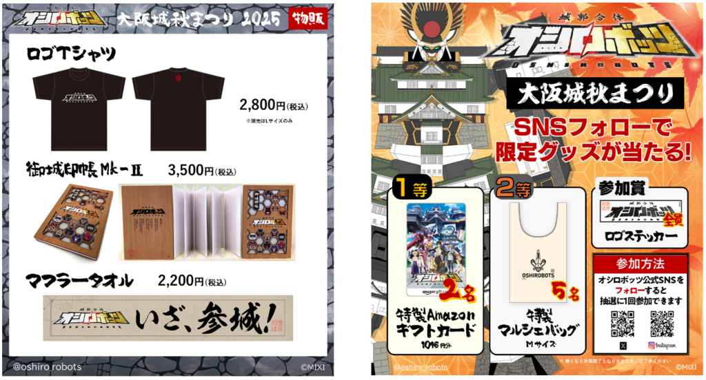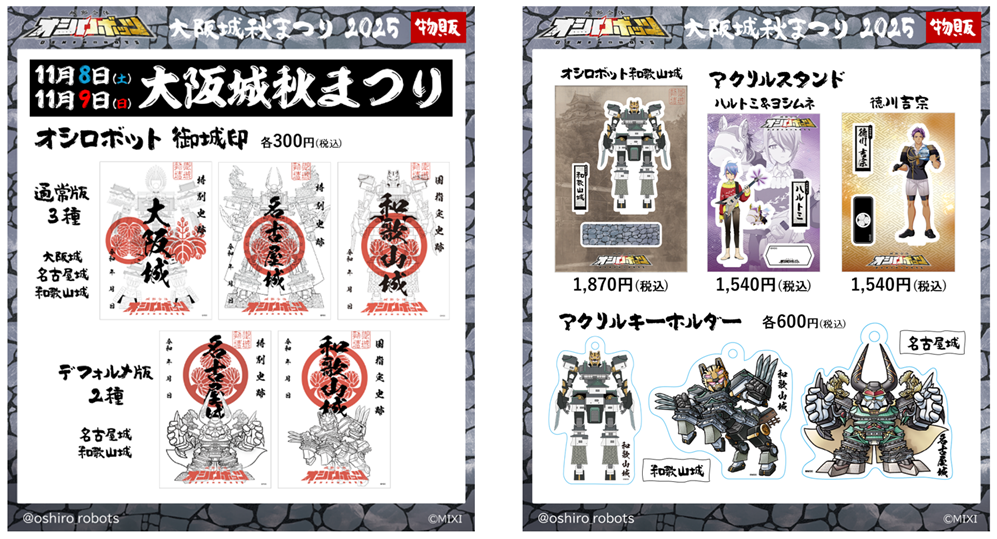 株式会社MIXI(東京都渋谷区、代表取締役社長 上級執行役員 CEO:木村 弘毅)は、2025年10月10日(金)から11月24日(月・祝)まで大阪城公園で開催中の「大阪城秋まつり2025」において、11月8日(土)・9日(日)の2日間、MIXI_ANIMEオリジナルコンテンツ『城郭合体オシロボッツ』のブースを出展します。ブースでは、「オシロボット大阪城」のトレーディングカードや解説書(チラシ)の無料配布に加えて、大阪城・名古屋城・和歌山城のオシロボッツグッズの販売も予定しています。