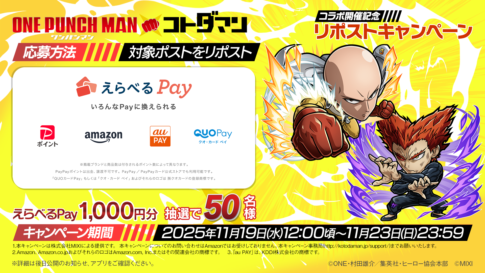 | キャンペーン名称① | アニメ「ワンパンマン」×「コトダマン」コラボ開催記念 リポストキャンペーン |