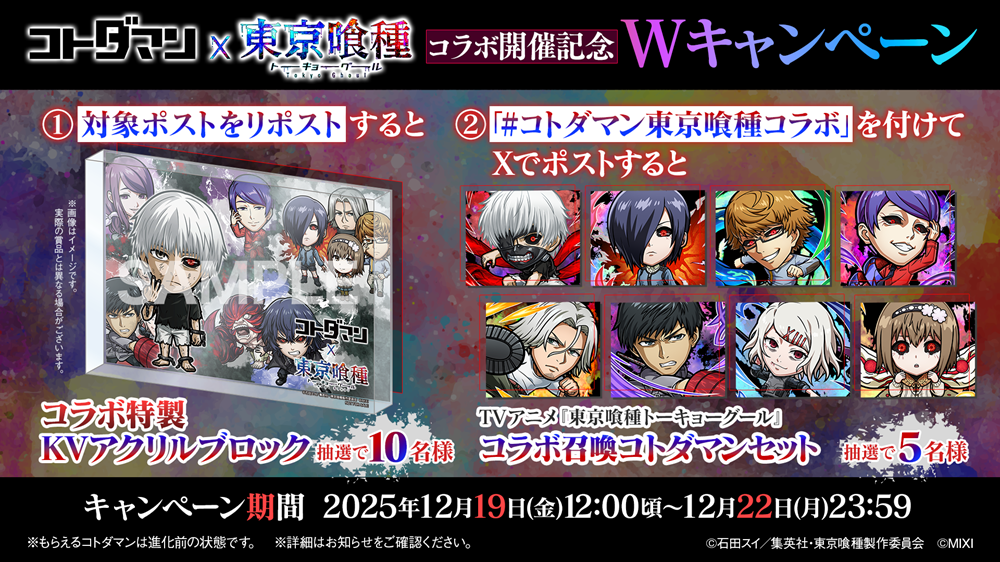 さらに、本日12月19日(金)よりコラボ記念スペシャルPVを公開します。そのほか、『コトダマン』×TVアニメ『東京喰種トーキョーグール』コラボ召喚コトダマンセットや「コラボ特製サコッシュ」などが抽選で当たるXキャンペーンを開催します。