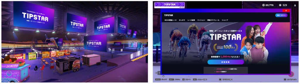 バーチャルの仮想競輪場内でパブリックビュー観戦や、「TIPSTAR」とのWebView連携による投票体験が可能。