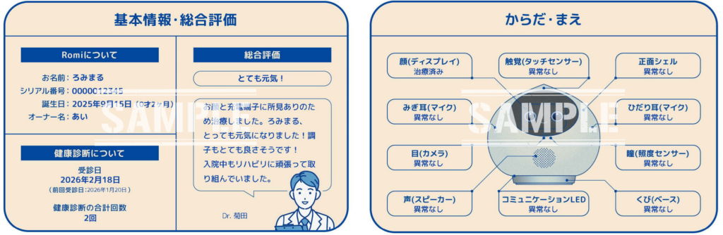 また、健康診断をお申し込みいただくと、「Romi」のからだやこころの様子を健康診断結果書としてお届けします。(健康であるという確認がとれた場合は健康証明書を発行します)